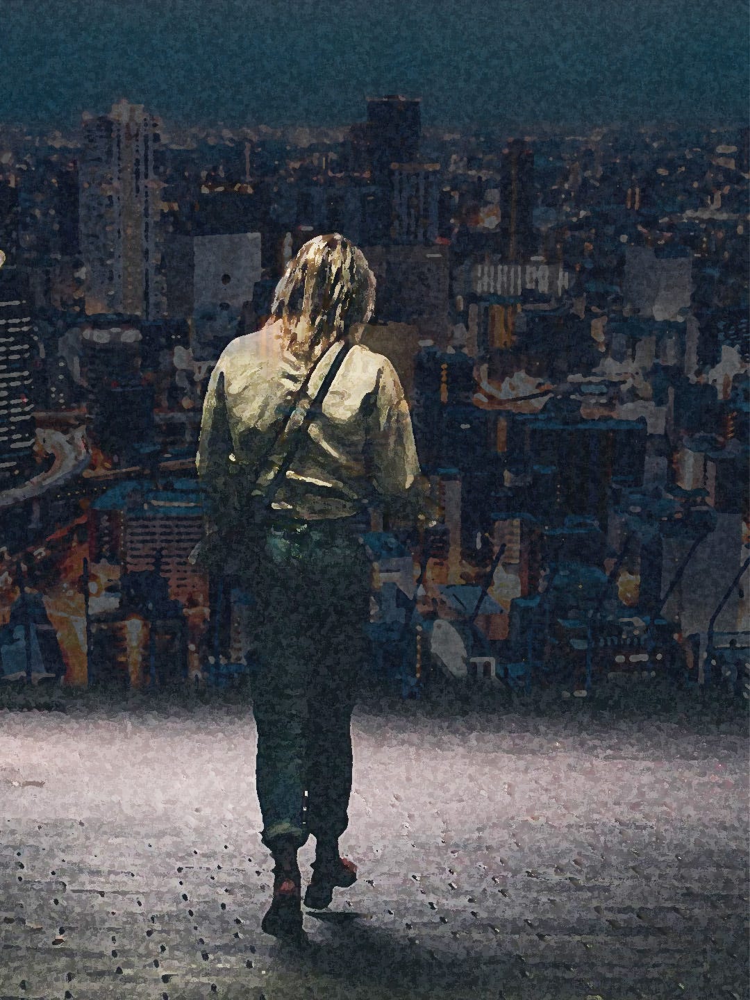 No, I think of her words now, as I walk, a woman with a purpose, a mission, down the wide street at night. A million eyes look down on me, gleaming from glassy skyscraper windows. How many people are still up there working or watching? Birds of prey looking for that foolish twenty-six-year-old woman who has decided to walk the jungle at night by herself. How many predators?